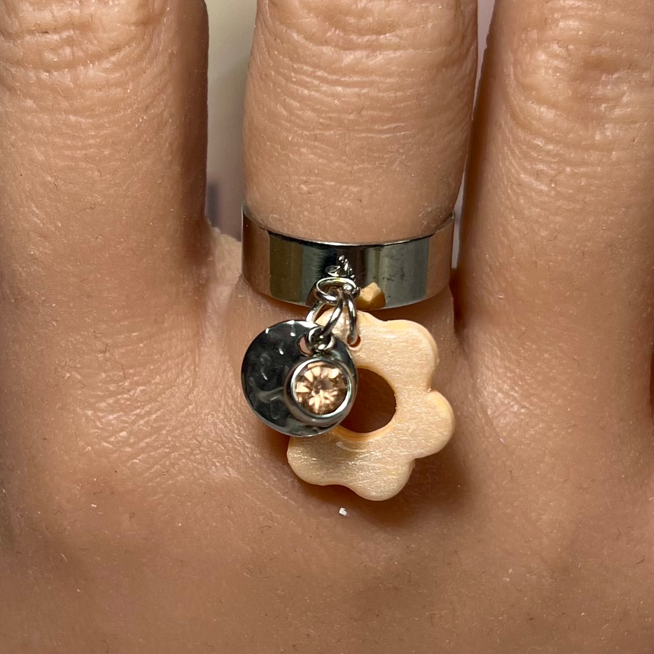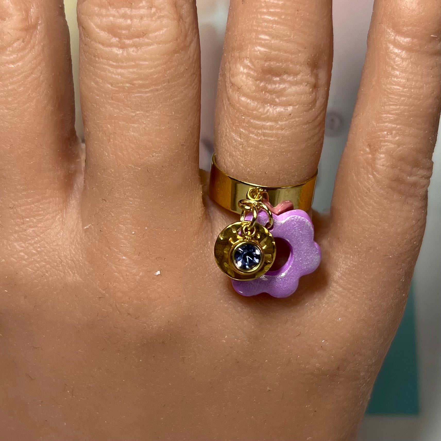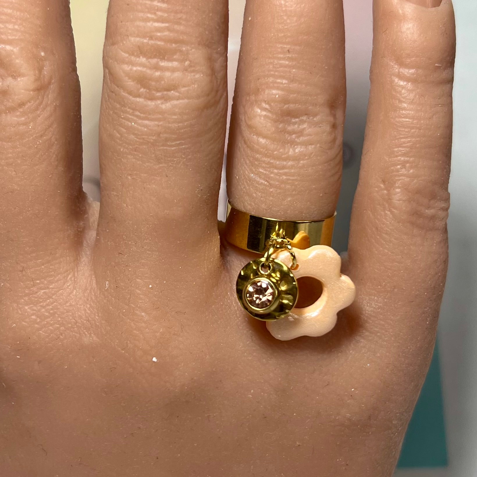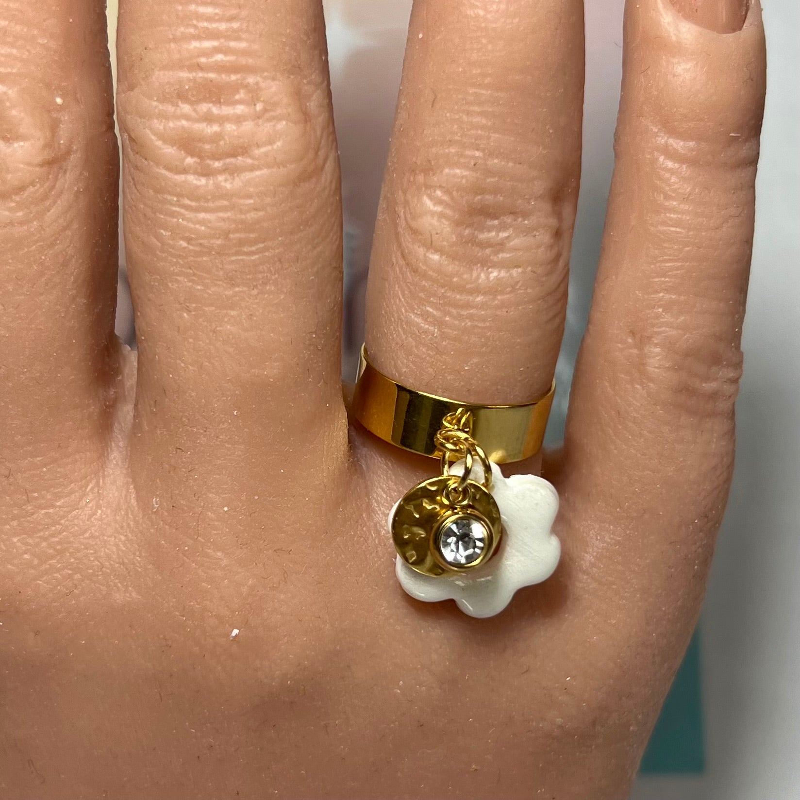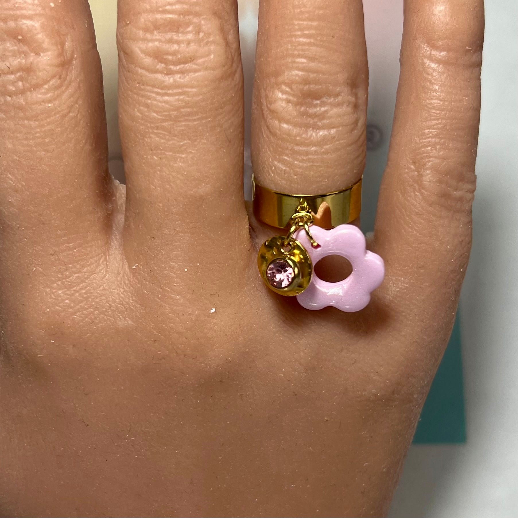 Craquez pour les bagues mini Flora, de véritables bijoux poétiques à porter au quotidien ! Chaque bague est composée d’une base ajustable en acier inoxydable, ornée de trois breloques délicates :