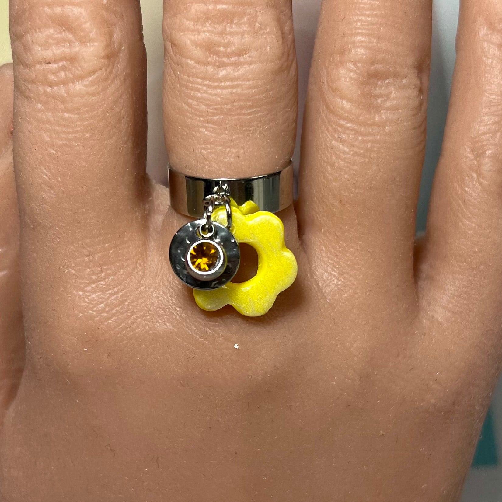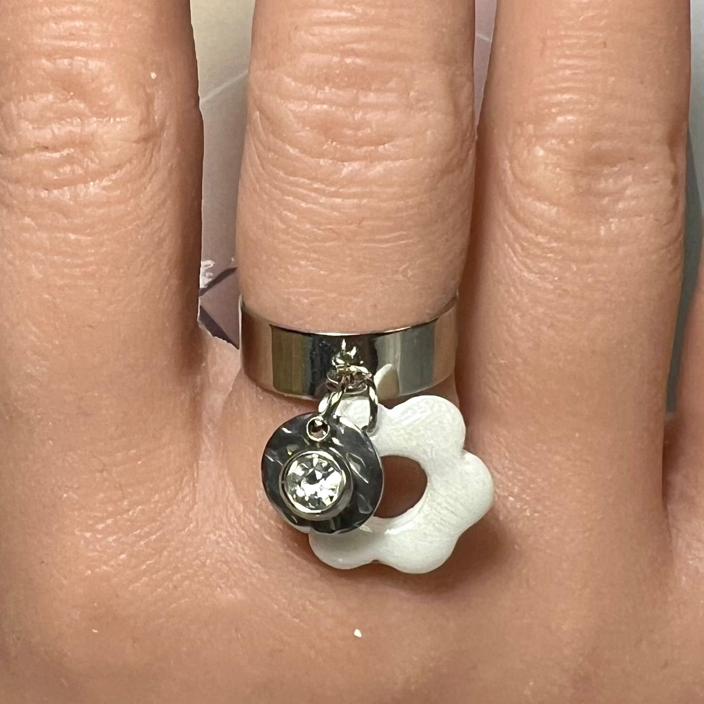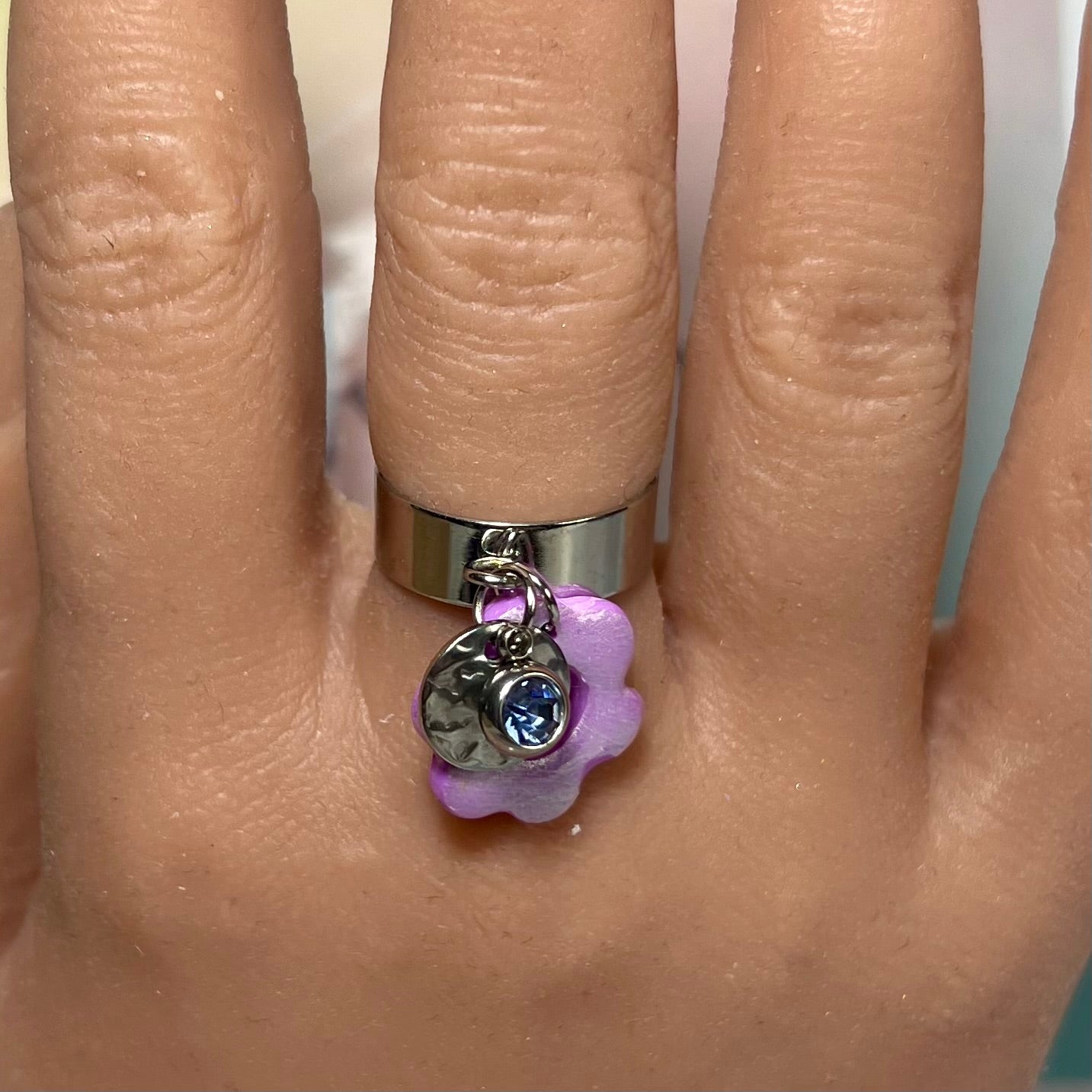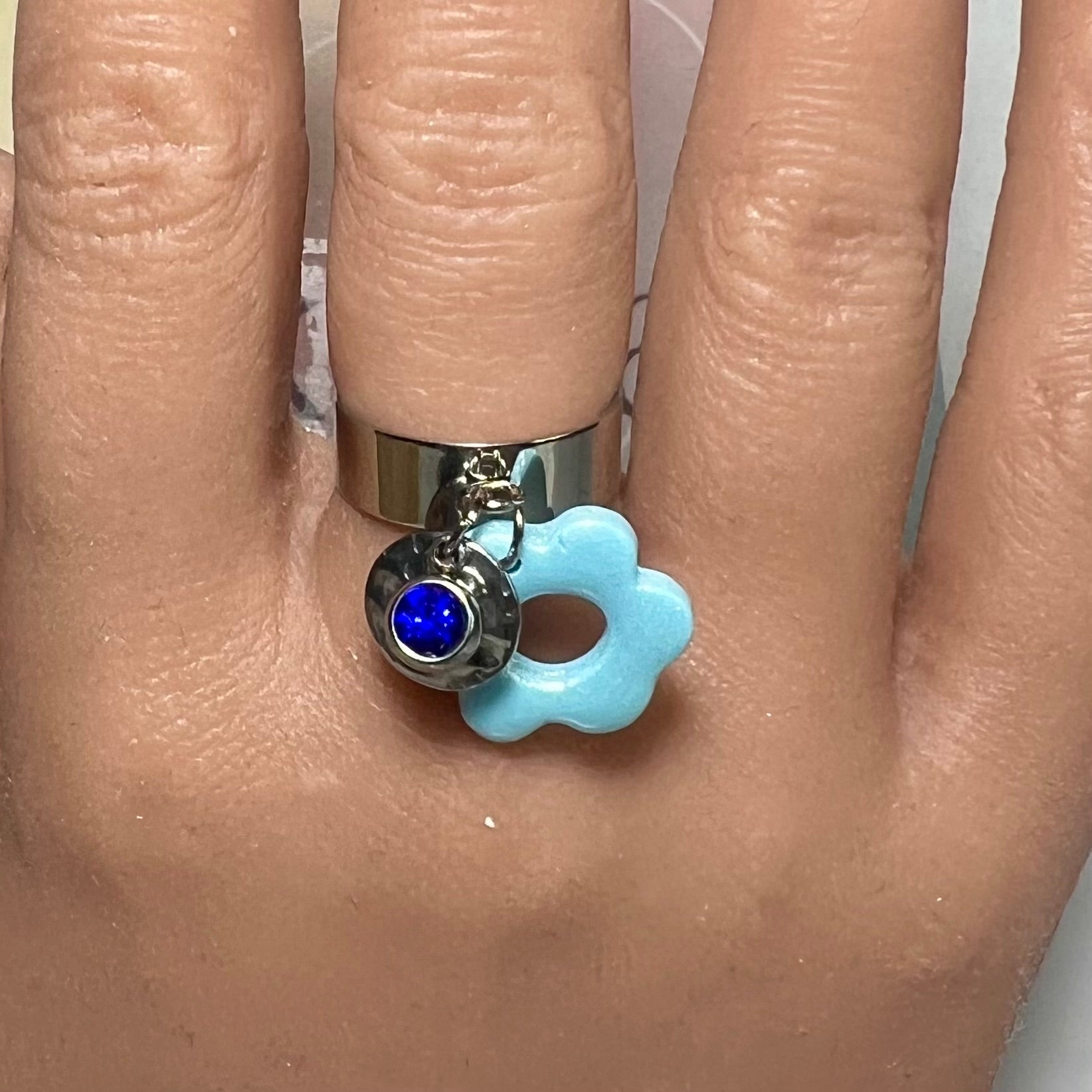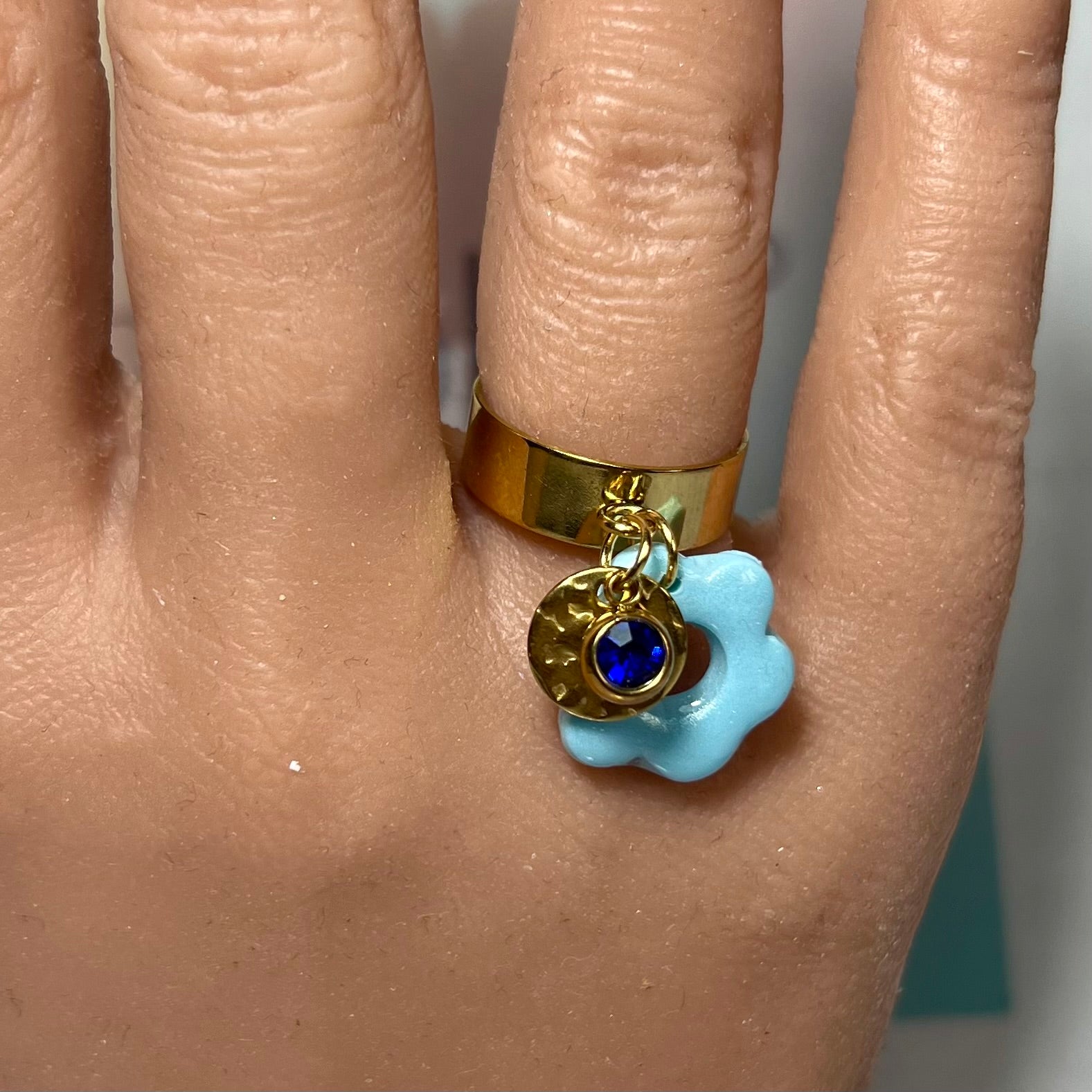 Craquez pour les bagues mini Flora, de véritables bijoux poétiques à porter au quotidien ! Chaque bague est composée d’une base ajustable en acier inoxydable, ornée de trois breloques délicates :
