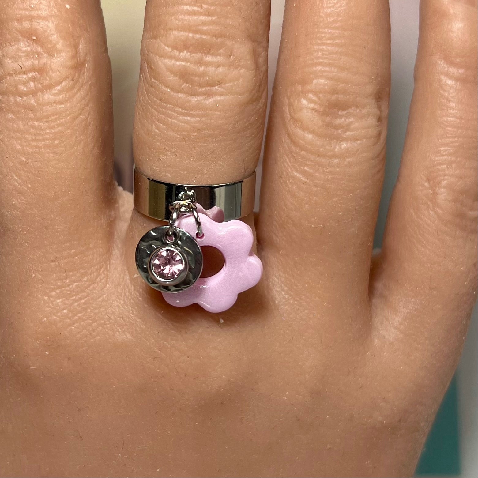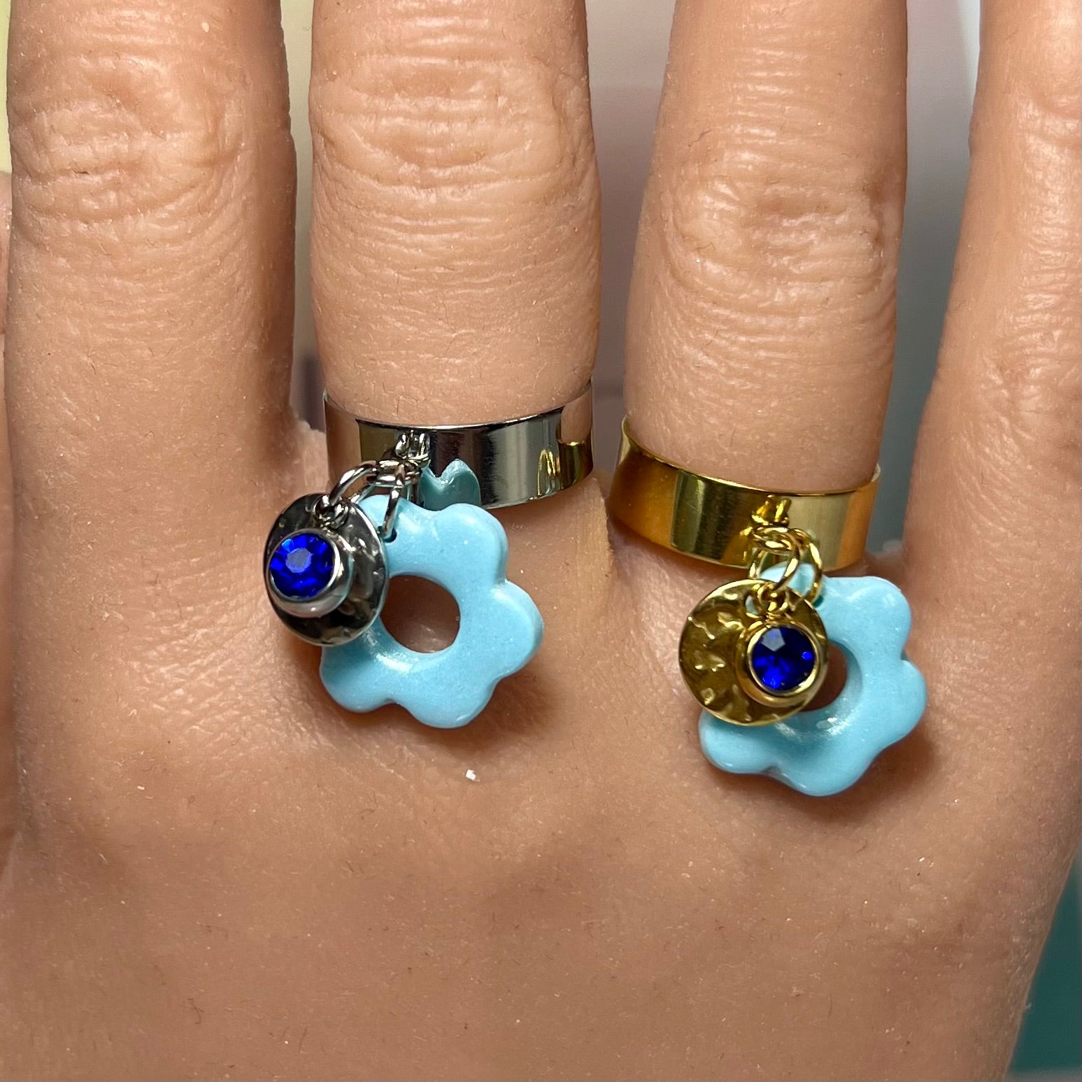 🌸 Bagues mini Flora – Ajustables en acier inoxydable avec fleur pastel rondelle martelée & strass