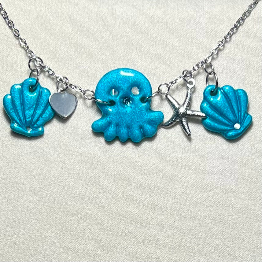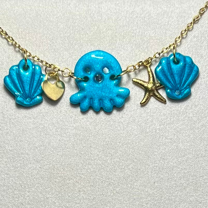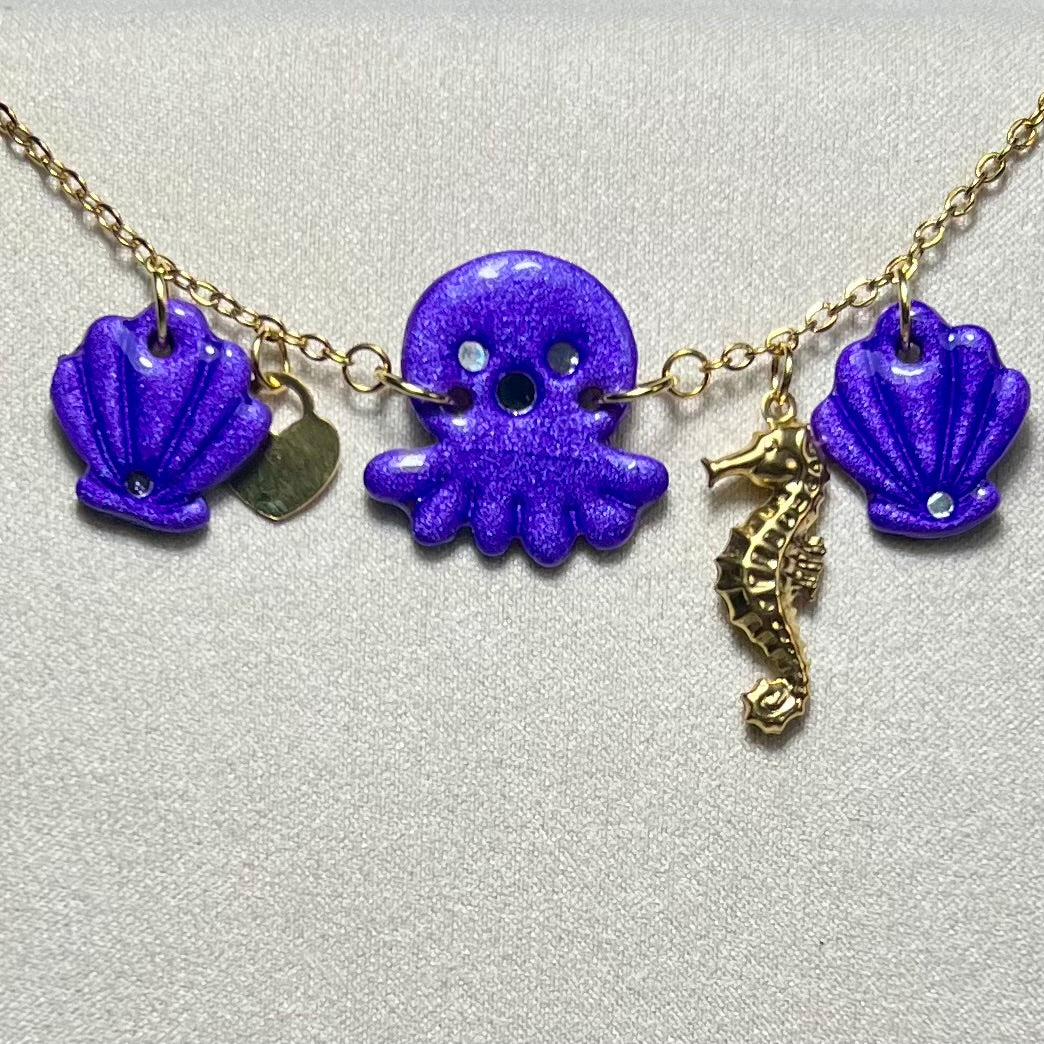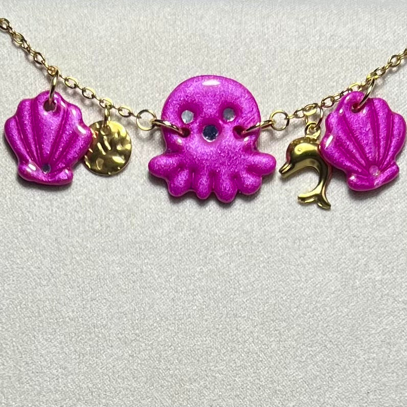 Plongez dans l’univers marin avec le Bracelet Poulpy 🐙✨ – un bijou fait main unique mêlant acier inoxydable durable, pâte polymère métallisée et charms marins raffinés. Disponible en 4 coloris envoûtants : turquoise , bleu, rose nacré et violet profond.